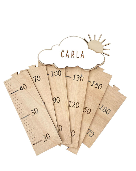 MEDIDOR INFANTIL DE MADERA CON NOMBRE ADHESIVO (ARCOIRIS, SOL Y LUNA)